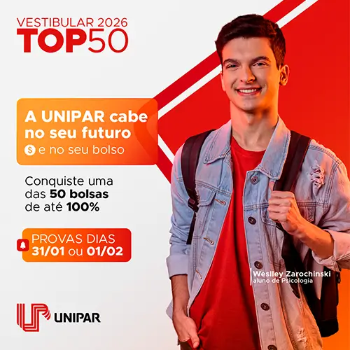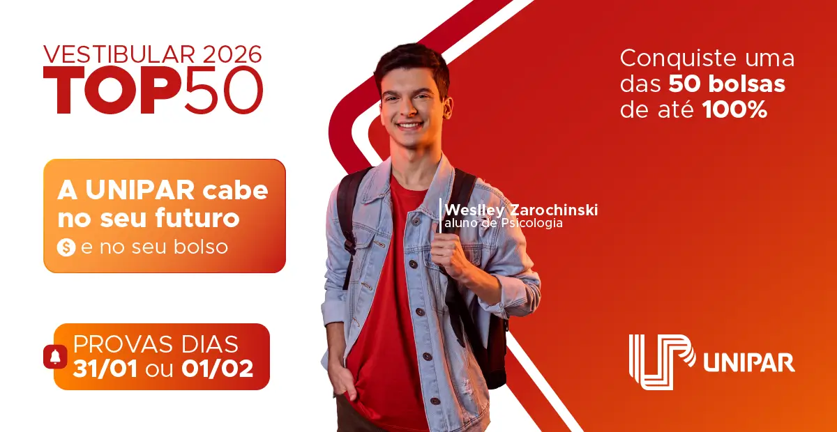 Vai encarar o desafio de ser um dos melhores e garantir sua vaga com até 100% de Bolsa? O Vestibular Top 50 UNIPAR chegou para mudar sua história! Não importa se você curte Exatas, Humanas ou Saúde: a UNIPAR tem o curso perfeito pra você mergulhar de cabeça.