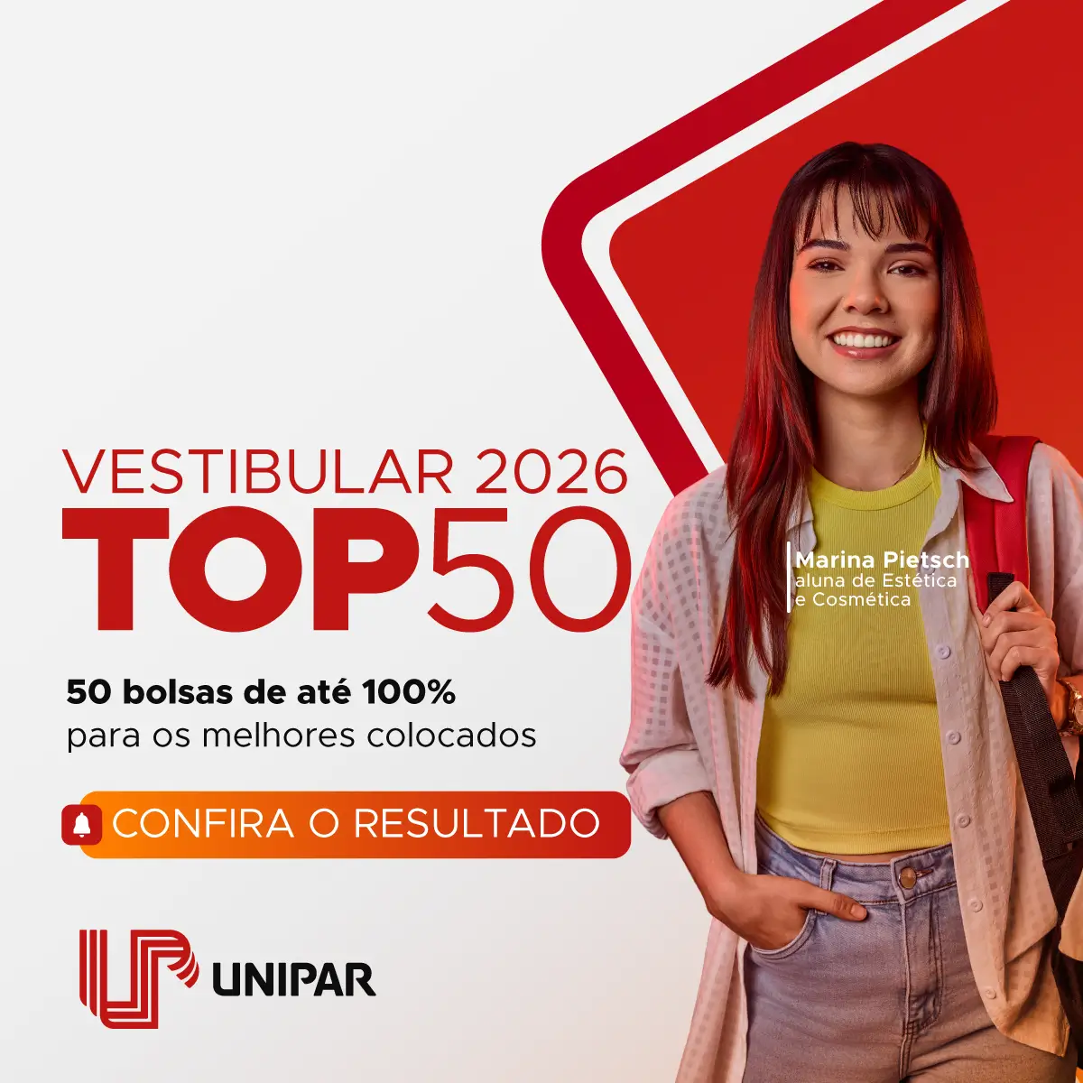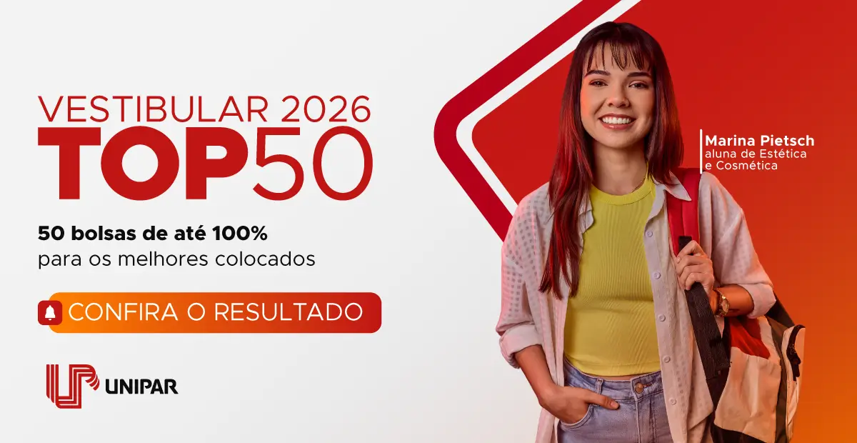 Vai encarar o desafio de ser um dos melhores e garantir sua vaga com até 100% de Bolsa? O Vestibular Top 50 UNIPAR chegou para mudar sua história! Não importa se você curte Exatas, Humanas ou Saúde: a UNIPAR tem o curso perfeito pra você mergulhar de cabeça.